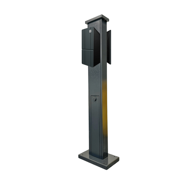 Wallbox Teltonika TeltoCharge 2×22 kW na słupku to inteligentna stacja ładowania samochodów elektrycznych firmy Teltonika Energy wyposażona w kable do ładowania z wtyczką typ-2. Stacja ładowania posiada przednią obudowę wykonaną z wysokiej jakości tworzywa sztucznego, która nadaje stacji nie tylko estetyczny wygląd, ale także wyróżnia ją spośród innych stacji ładowania dostępnych na rynku.